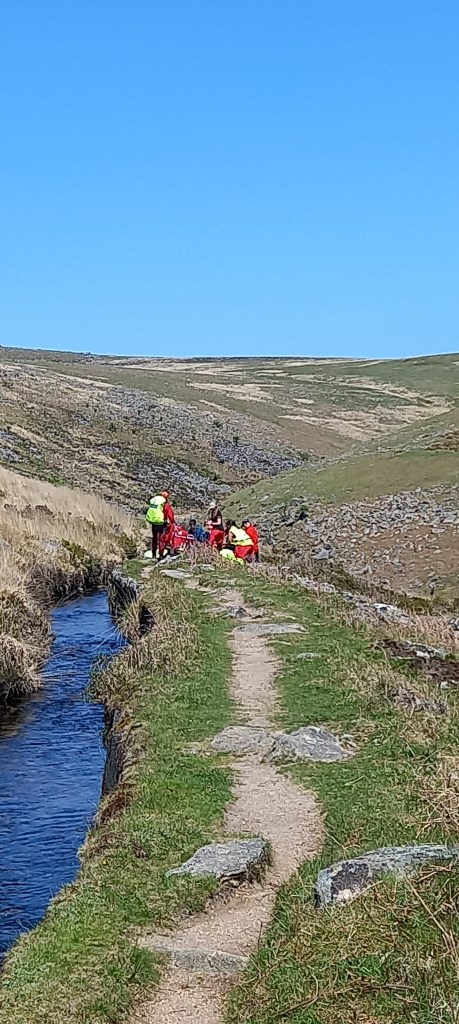 Incident 11 At around 12:30 the Police requested our assistance with an incident in Tavy Cleave. A 25 year old male had fallen when trying to jump across the leat, and sustained a suspected fracture to his lower leg or ankle. Our response teams were able to reach him quickly as several of our hill parties were close by, monitoring the teams taking part in the Army Ten Tors event. He was assessed and analgesia administered before his leg was immobilised with a vacuum splint. He was then stretchered along the narrow, rough path alongside the leat to be transferred to an Ambulance at Lanehead. The Ambulance then tranported him to hospital, while our members returned to providing safety cover for Ten Tors.