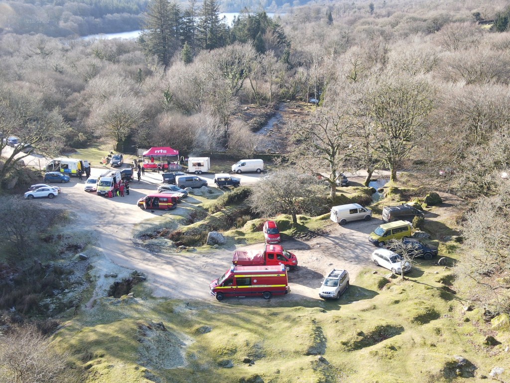 Incident 2. At 08:59 our team was called by the Police to resume a search of the Burrator area for the subject of our previous search who was believed to still be on the moor in spite of freezing overnight conditions. A multi-agency search began involving our members along with Police, including a dog team and drone team, HM Coastguard and the Urban Search and Rescue team from the Fire Service. Devon & Cornwall 4×4 Response assisted in transportation of personnel. The subject was located in woodland by a DSRT Tavistock team at 12:30, and his condition was assessed. He was then escorted to a team Land Rover and transported to the RVP at Norsworthy Bridge. A successful outcome to a lengthy search incident. Many thanks to Rapid Relief Team for attending once more to provide hot drinks and food to all involved in the search.