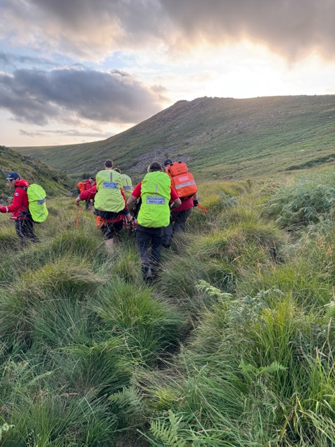 Incident 20. At 17:21 the team was called at the request of the Ambulance service to extract an injured person from the upper part of Tavy Cleave. Hill parties were deployed from Willsworthy Butts, along the track by Land Rovers to take a stretcher and medical equipment to the casualty site. Rope rescue kit was also taken for security on the steep ground. The casualty was unable to stand or walk without pain and so the leg was splinted, pain relief administered and then the casualty was stretchered by team members to an ambulance at Lane End. The other two walkers were uninjured and able to walk off with the stretcher party. It was a challenging route off and took almost two hours, with the casualty handed over to paramedics at 20:50. Our thanks to Devon & Cornwall 4×4 Response for providing two vehicles for logistical support. We wish the casualty a speedy recovery.